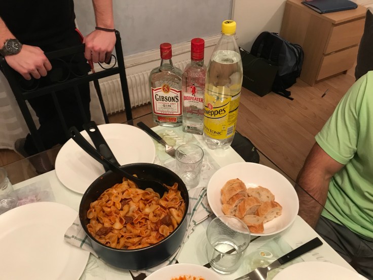 When we got back, Jonathon and Nick started on dinner. Katie and I helped set the table and make other preparations. After some time, our dinner was ready and we were all starving. I was very excited for the pasta, sausage, baguettes, cheese and macaroons.