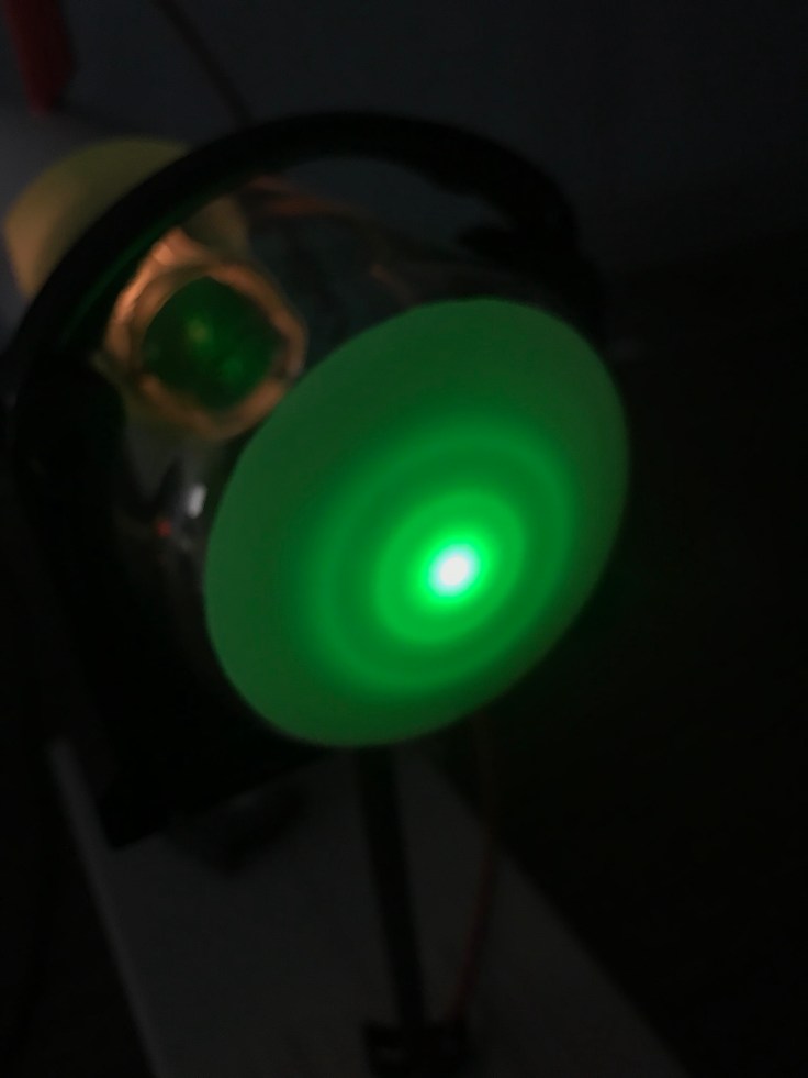 This is probably confusing without some physics knowledge, but essentially these circles prove that electrons act as waves. A big concept in physics is that light can act as both light and a waves. We recorded the voltage to the device and the resulting circle diameters. This allowed us to calculate the wavelength of the light.