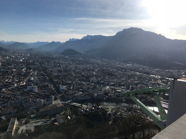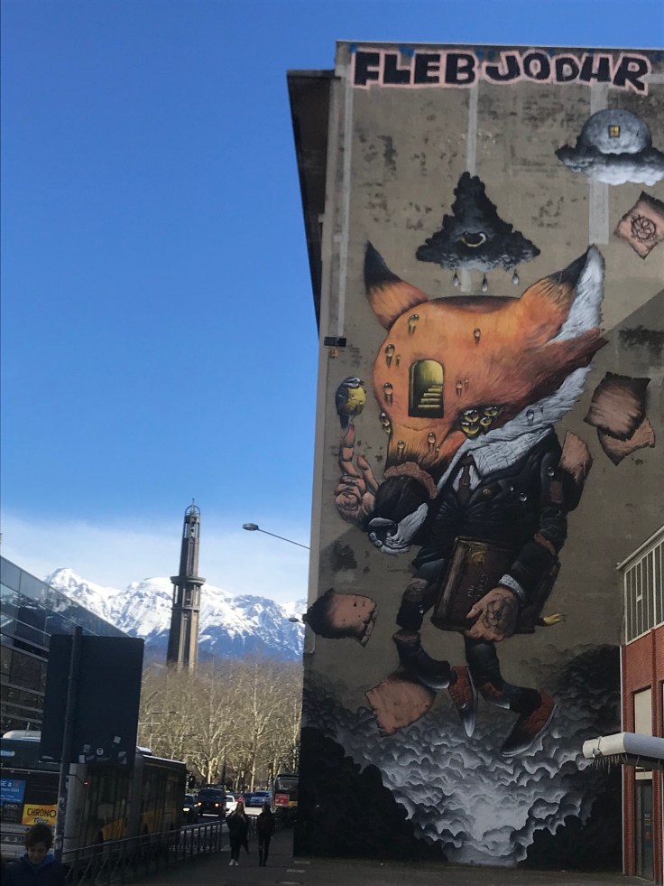 Here’s a picture I took featuring: One of Grenoble’s many murals, the tower in Parc Paul Mistral and the alps of course
