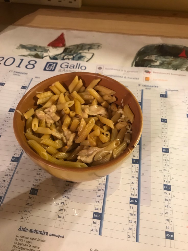 When I got back, I was starving and wanted to make a second attempt at Mac and cheese. I had some new plans today. I got an actual bowl from Anne-Marie, but couldn’t remember the names for salt and pepper in French. I found a packet of seasoning for soup broth in my room, and figured that could work as a substitute.
