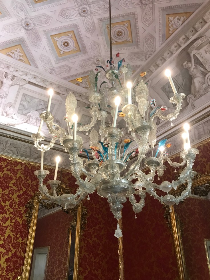 A very fancy and very old glass chandelier from Murano, the island of glass.