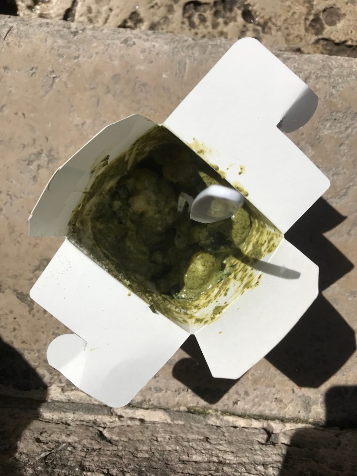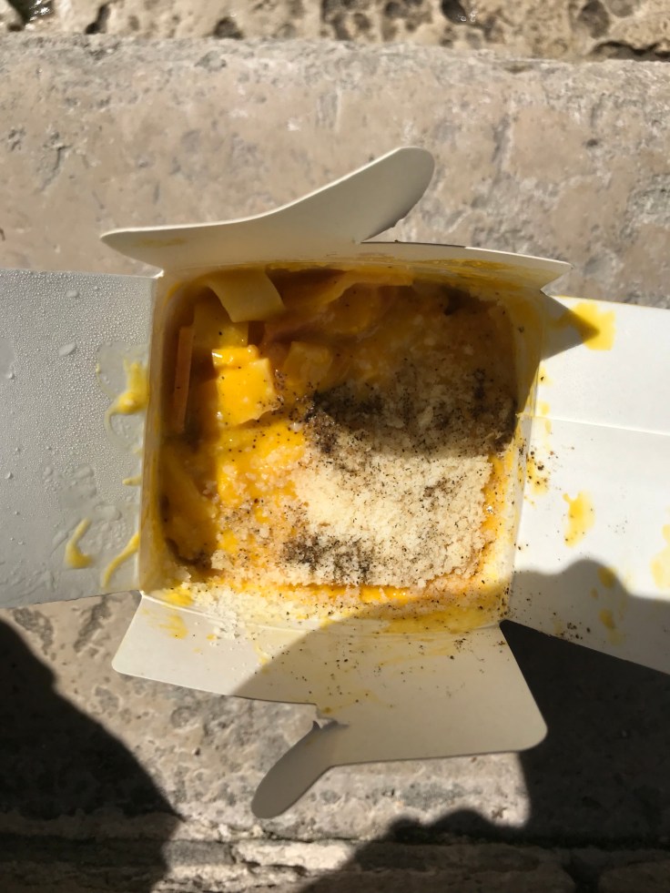 We were all hungry and headed to this restaurant known for selling pasta-to-go in Chinese-like takeout boxes. There was a bit of a line, so we knew it would be good. The boxes weren’t huge, so I got a box of pesto gnocchi and a box of fettucini carbonara. We found a spot around the corner to eat them while sitting next to a canal.